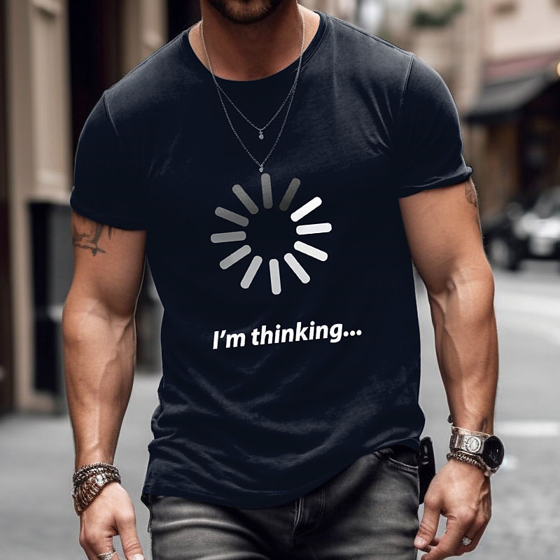 Mens Funny Tech Humor T-Shirt: 'I'm Thinking...' Loading Spinner Graphic Short Sleeve Tee