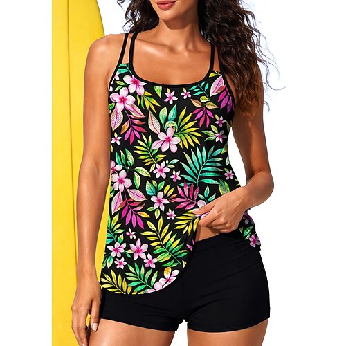 Costume da bagno tankini da donna 2 pezzi pantaloni corti palmo controllo pancia vita alta slinguato senza schiena vacanza in spiaggia scollatura rotonda floreale con maniche corte