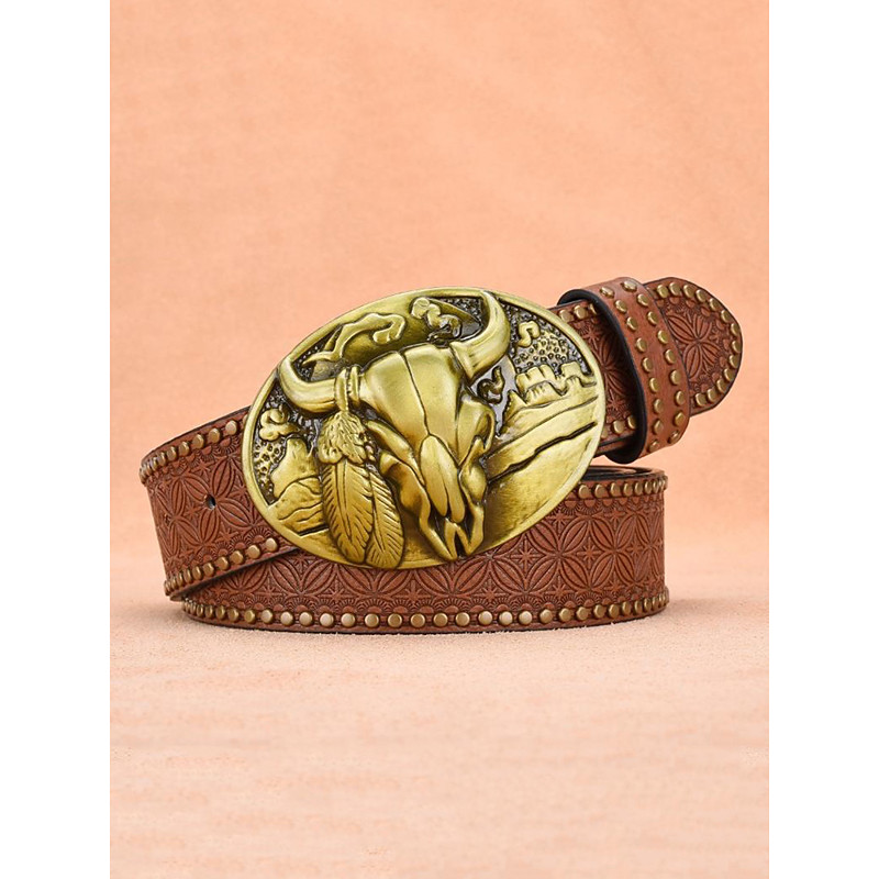 Men's western style faux leather belt with a bull skull bronze buckle, Perfect for casual and cowboy outfits