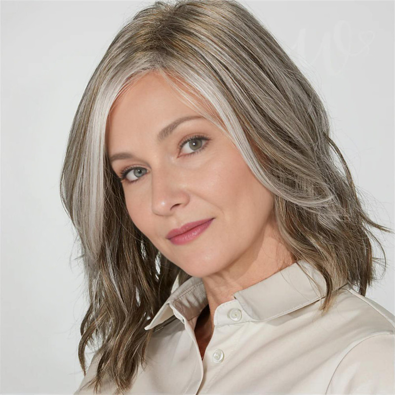 Women's Silver Grey Brown Mix Medium Wavy Wig Natural Looking Realistic Synthetic Hair Heat Resistant Side Part Elegant Daily Wear Fashion Style