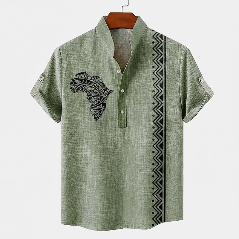 Men's Geometric Pattern Tribal Ethic / African Shirt Button Down Shirt Short Sleeve Vintage Retro Holiday Casual Daily Summer Spring Standing Collar Henley Collar 3D Print Linen Like Shirt Dark Khaki