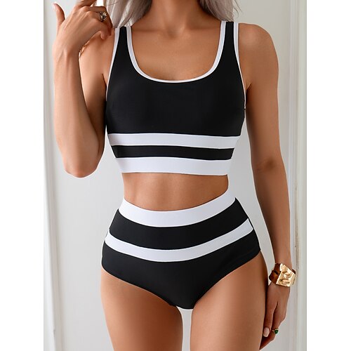 Costume da bagno due pezzi tankini da donna con slip colorblock controllo della pancia vita alta slanciato senza schienale abbigliamento da spiaggia per le vacanze righe collo a U senza maniche