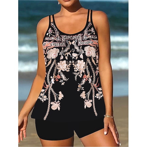 Costume da bagno tankini 2 pezzi da donna pantaloni shorts controllo della pancia alta vita slim senza schiena vacanza mare abbigliamento paisley a righe collo a U senza maniche