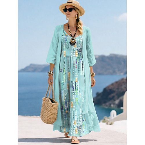 Per donna Insieme del vestito Abito a trapezio Vacanza Casual Grafico Geometria Stampato Abito maxi Manica 3/4 Scollo a V Spiaggia Blu Rosa Viola Estate Primavera Vestibilità comoda