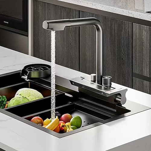 Rubinetto Cucina A Cascata Estraibile Miscelatore Lavello Vasca Rubinetti Display Digitale Lcd, Con Tubo G1/2 Freddo E Caldo