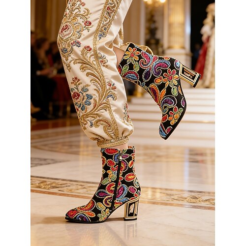 Damen Mardi Gras Pailletten-bestickte Ankle Boots - Bunte Barock-Karneval-Stil kurze Stiefel für Partys Festivals Maskeradenfeierlichkeiten