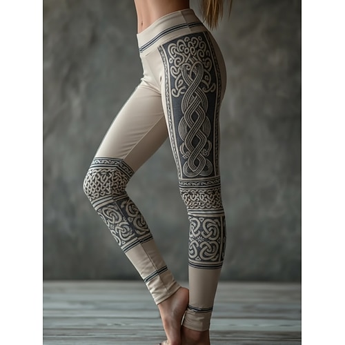 Damen-Leggings im Wikinger-Stil, kuschelig, für Urlaub, Vintage, Ethno-Look, lang, hoher Bund, abstrakter Grafikdruck, bequem, hochelastisch, für Urlaub, Freizeit, Alltag, beige, grau, Frühling,