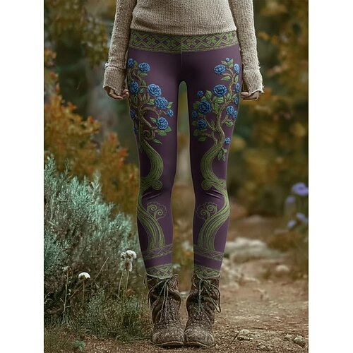 Damen-Leggings im Wikinger-Stil, kuschelig, lässig, für Urlaub und Freizeit, lange Länge, hoher Bund, florales Grafikmuster, bequem, hochelastisch, für Alltag und Outdoor-Aktivitäten, dunkelgrün,