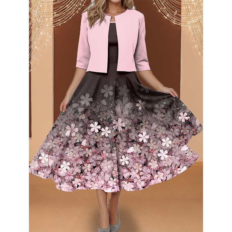 Women's Two Piece Dress Sets Midi Dress with Jacket Elegant A Line Dress Half Sleeve Print Dress Floral Print Crew Neck Daily Pink Spring Fall Regular Fit