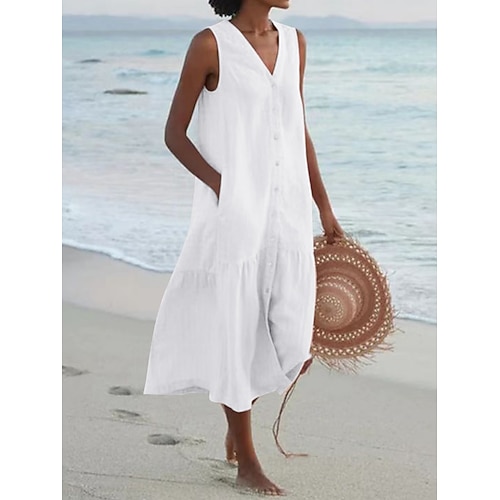 Per donna Nero Blu Verde Estate Primavera Abito Midi Abiti in cotone e lino Abito estivo in cotone Casual Vacanza Quotidiano Vestibilità comoda Semplice Scollo a V