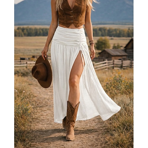 Per donna Gonna da vacanza Elegante Vintage Moda Casual Maxi Vita Alta Gonne Semplice Arricciato Patchwork Con Spacco Inelastico Quotidiano Spiaggia Aalbicocca Nero Bianco Verde Estate Cotone
