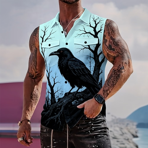 Herren Krähe Farbverlauf Raven Hemd Knopfhemd Ärmelloses Shirt Ärmellos Dunkler Gothic-Stil Outdoor Lässig Sommer Frühling Umlegekragen 3D-Druck Zwei Fronttaschen Blau Orange Grün