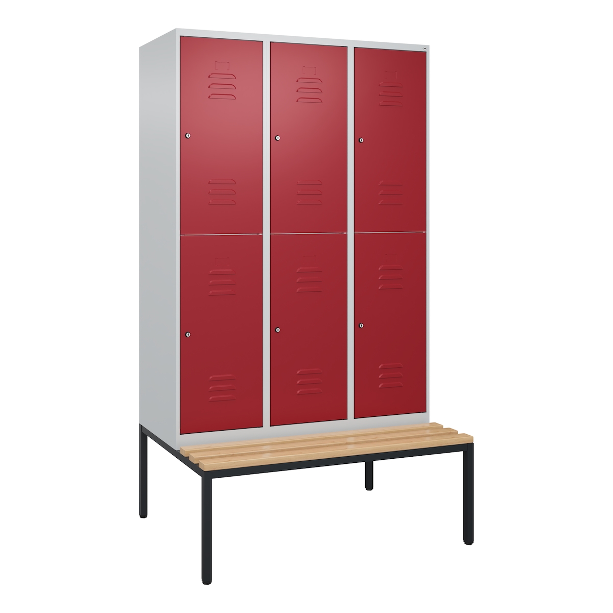 C+P Spind Classic PLUS, Buche untergebaute Sitzbank-Harthol, 6 Abteile, HxBxT 212x120x82cm, Zylinderschloss, Hellgrau/Rubinrot von PROREGAL