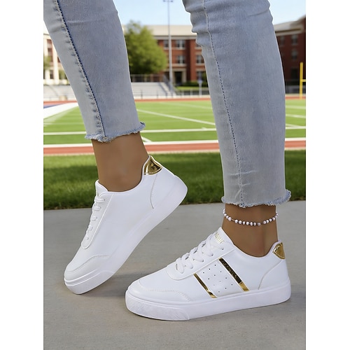 sneakers da donna bianche con lacci e dettagli dorati: classiche sneakers basse in similpelle alla moda per l'uso quotidiano, lo street style, le passeggiate e le uscite casual