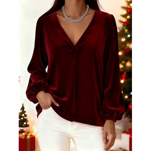 Natale Per donna Blusa Tinta unica Elegante Essenziale Casual Manica Lunga Scollo a V Top Regolari Quotidiano Ferie Blu Vino Viola Verde Primavera Autunno Inverno