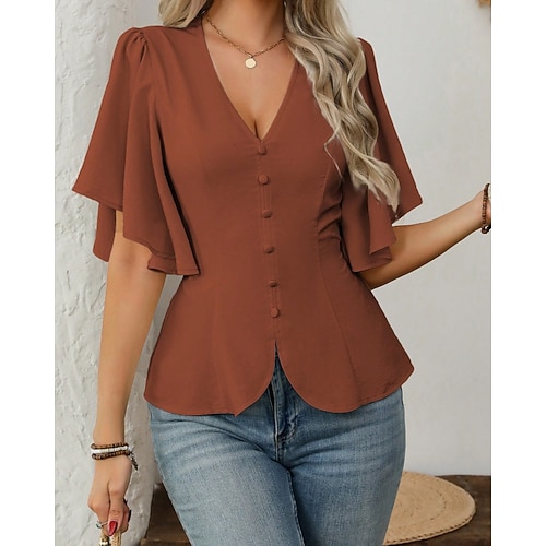 Per donna Camicia Blusa Semplice Elegante Moderno Manica Lunga Scollo a V Top Regolari Quotidiano Ferie Uscire Bottoni Nero Vino Verde militare Marrone chiaro Marrone Estate Primavera