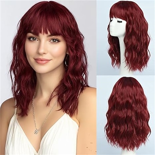 Perücken mit Pony für Frauen, Perücke aus Kunsthaar, natürlich aussehend, hitzebeständig, gewellte Perücken