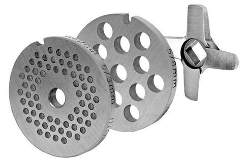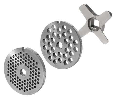 WOLFCUT - Fleischwolfscheibensatz 3 mm + 8 mm Bohrung und ein Kreuzmesser kompatibel mit allen gängigen Fleischwolf Marken Größe 5