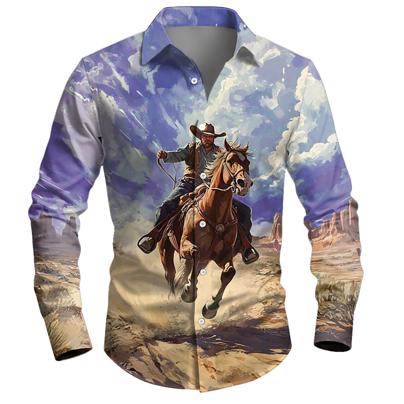 Men's Cowboy Riding Horse Shirt Western Shirt Cowboy Shirt Long Sleeve Vintage Retro Casual Outdoor WorkWear Spring Fall Turndown 3D Print Button Up Shirts Blue Purple