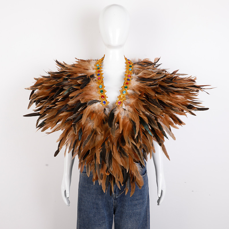 Women's Mardi Gras Feather Cape Shawl, Purple Green Gold Feather Poncho with Jeweled Collar, Carnival Parade Costume Accessories