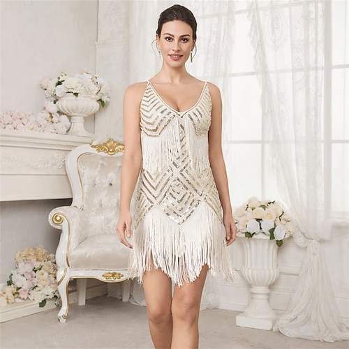 Goldene Zwanziger 1920er Cocktailkleid Mini Kleid Ärmellos Der große Gatsby Quastenfransen Pailletten Quaste V Ausschnitt Kostüm Damen Nacht Besondere Anlässe Club Retro-Mottoparty Erwachsene Kleid