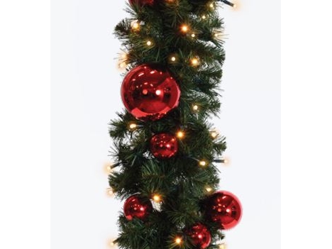 Granguirlande med røde kugler og varmt lys. 700 cm / 87 kugler