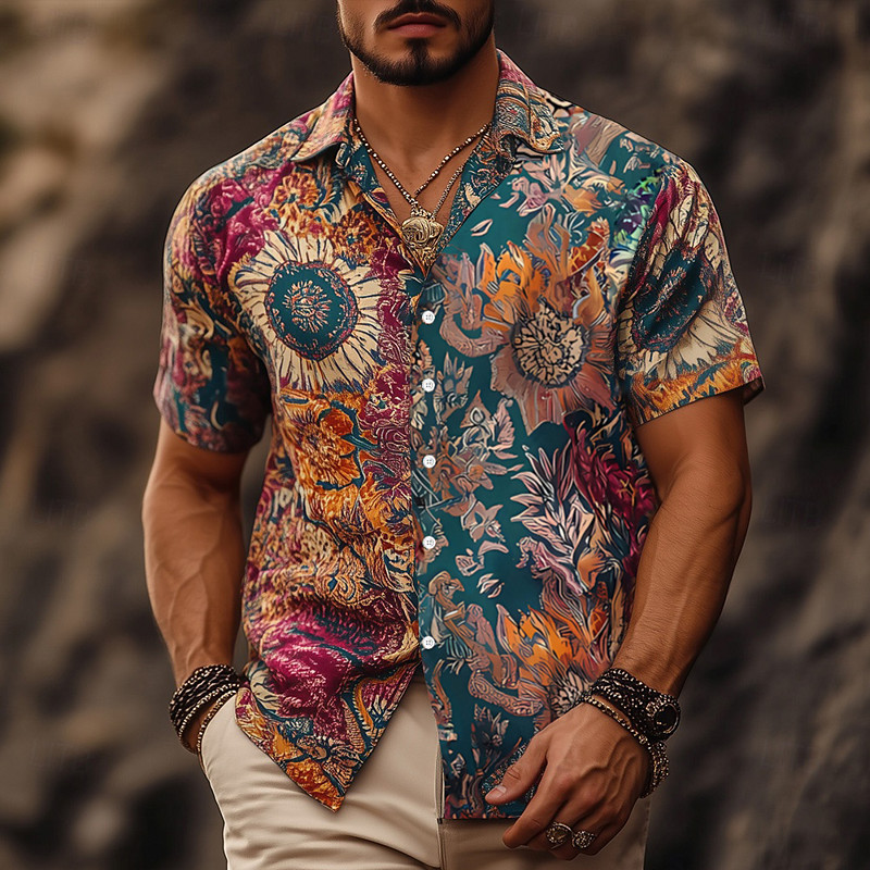 Men's Indian Boho Ethnic Shirt Summer Hawaiian Shirt Button Up Shirt Short Sleeve Hawaiian Vacation Holiday Beach Wear Summer Spring Turndown 3D Print Collared Shirts Red