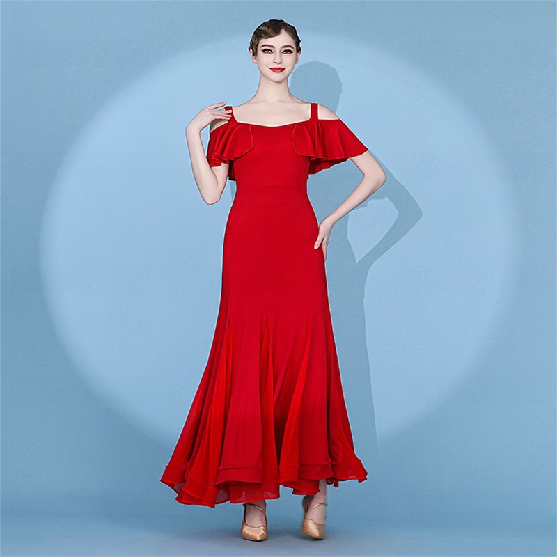 Red Ballroom Dance Dress with Off-Shoulder Sleeves, Elegant Flowing Skirt for Latin Social Dancing
