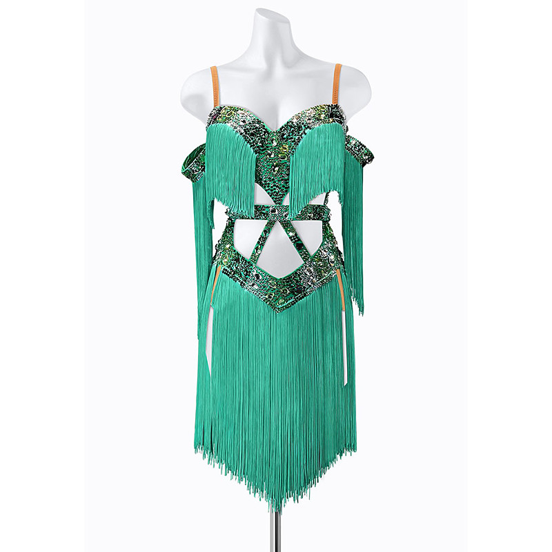 Women's Teal Green Sequin Fringe Latin Dance Dress - Cold Shoulder Cutout Asymmetrical Ballroom Performance Costume