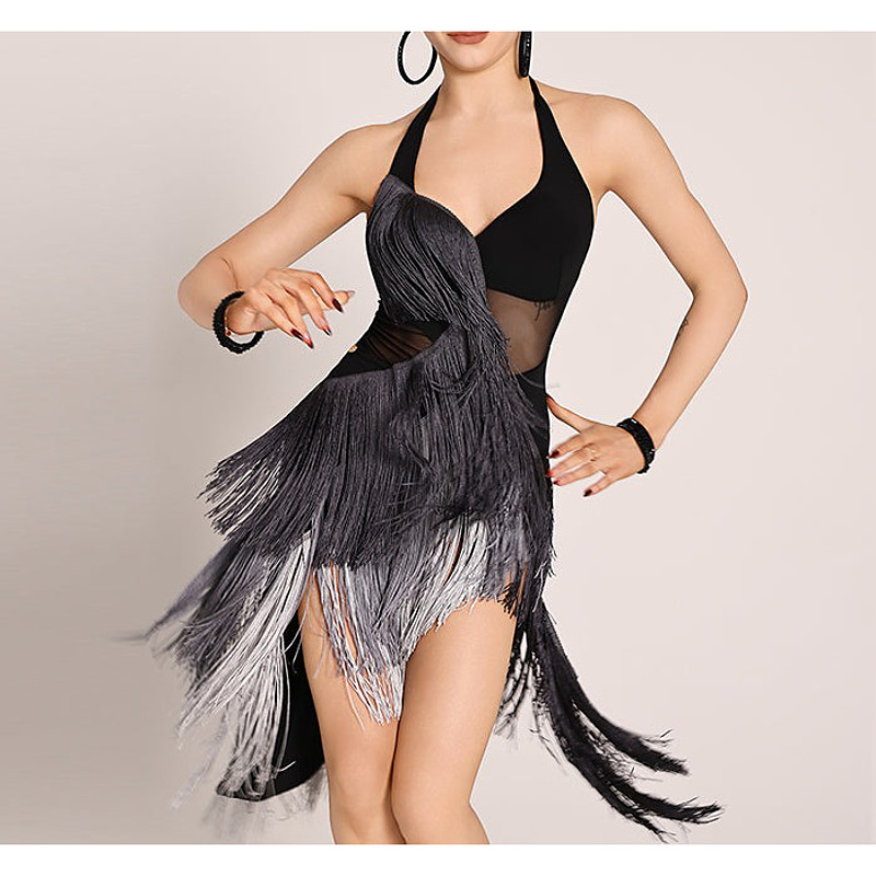 Women's Black Grey Ombre Fringe Latin Dance Dress - Halter Neck Mesh Panel Asymmetrical Ballroom Performance