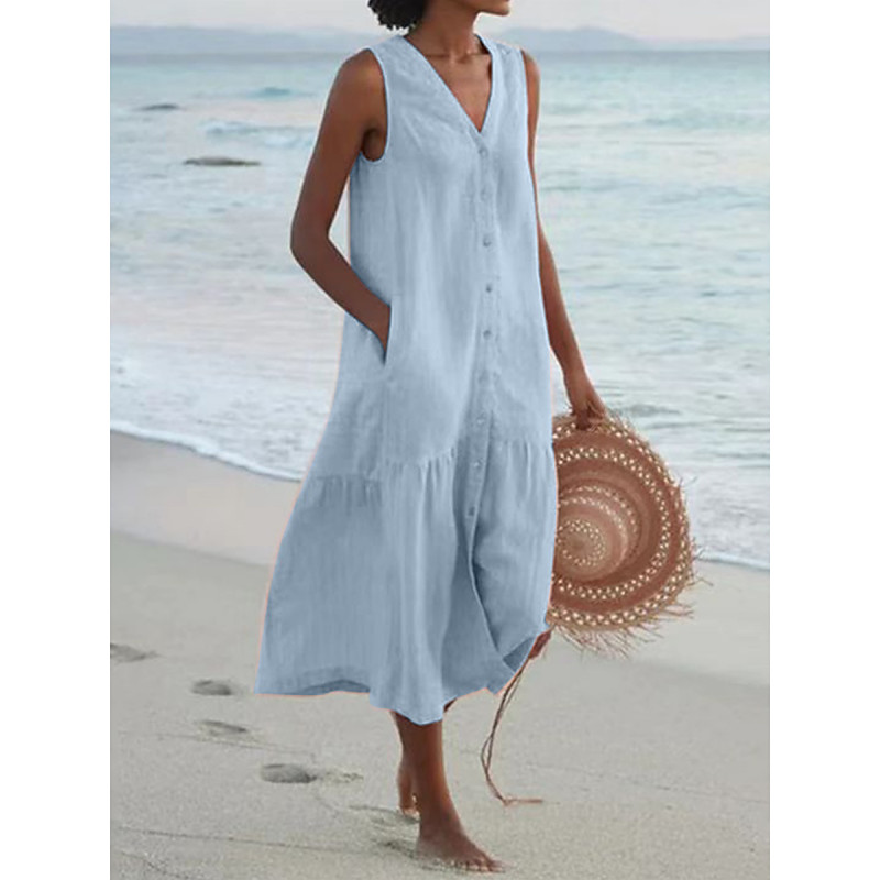 Women's linen like Midi Dress Shift Dress Summer Dress Casual Daily Loose Fit Plain Sleeveless V Neck Blue White Light Green Pink Summer