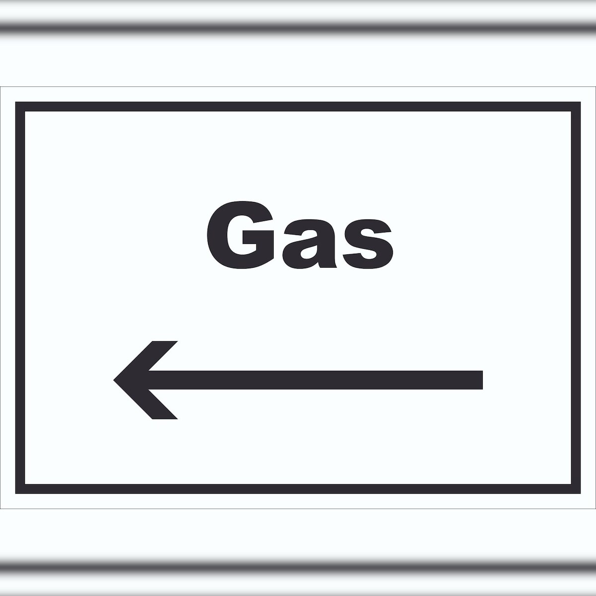 HB-Druck Gas Schild mit Text und Richtungspfeil links Anschluss waagerecht A6 Rückseite selbstklebend