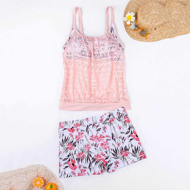Women's Tankini 2 Piece Swimsuit Palm Shorts Tummy Control High Waist Slim Backless Vacation Beach Wear Floral Scoop Neck Sleeveless Bathing Suits