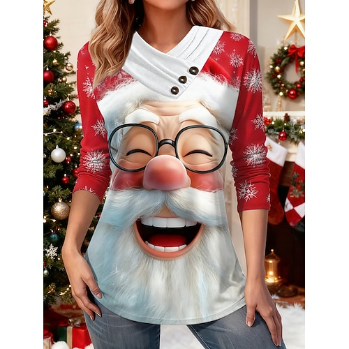 Natale Per donna Maglietta Grafico Pupazzo di neve Fiocco di neve Elegante Casual Manica Lunga Scollo a V Top Regolari Quotidiano Bottoni Stampato Asimmetrico Blu Bianco Giallo Vino Rosso Autunno