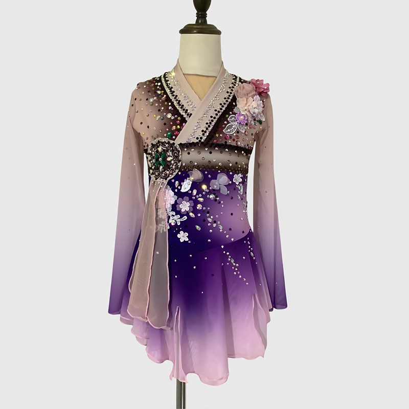 Eiskunstlaufkleid Damen Mädchen Eislaufen Kleid Purpur Daumenloch Halo-Färbung Hohe Elastizität Professionell Wettbewerb Eiskunstlaufkleidung Thermowarm Kristall / Strass Langarm Eislaufen