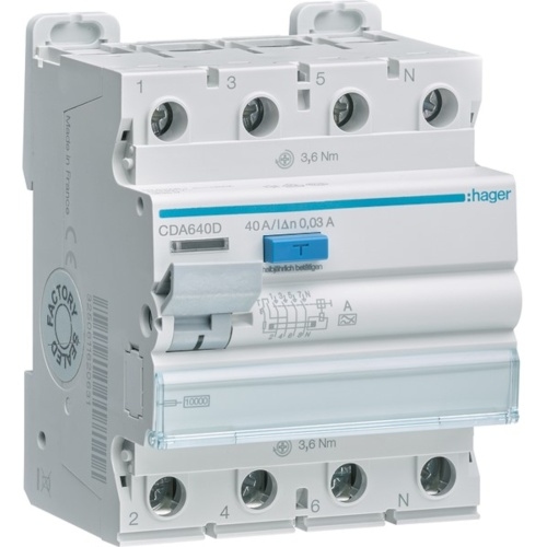 Hager FI-Schutzschalter, A, 4p, 400V, 40A, 0,03A, 4TE, DIN-Schiene, 10kA, 3kA/stoß, CDA640D