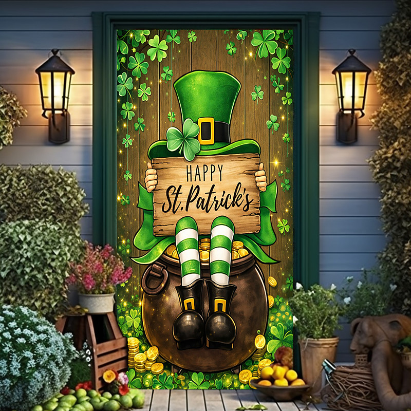 St. Patrick's Day Door Cover, Leprechaun Feet in Striped Socks Holding 'Happy St. Patrick's' Sign, Festive Entrance Decoration for St. Patrick's Day Celebration.