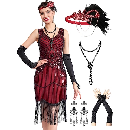 Set Anni Ruggenti Anni 1920 Abito da cocktail Mini Abito Flapper Vestito Abiti con accessori Senza maniche Il grande Gatsby Charleston Paillettes Frangia con nappe Piuma Scollo a V profondo Costume