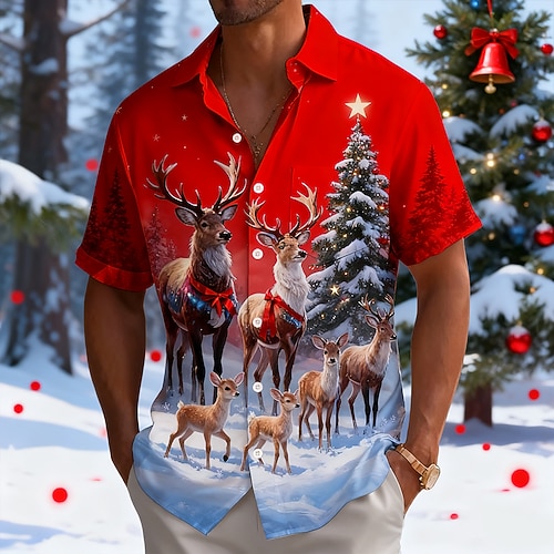 Weihnachten Herren Weihnachtsbaum Rentier Schneeflocke Hemd Knopfhemd Kurzarm Modisch lässig Ferien Sommer Frühling Umlegekragen 3D-Druck Hemden mit Kragen Eine Tasche vorne Blau Blau 2# Blau 1# Rote