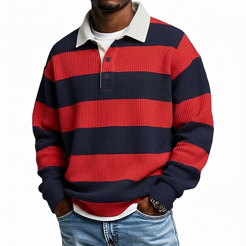 Men's Horizontal Stripes Waffle Polo Shirts Rugby Polo Rugby Polo Shirts Long Sleeve Polo Shirts Lapel Sportswear Casual School Athleisure Daily Wear 3D Print Spring Fall Winter Blue Yellow Purple