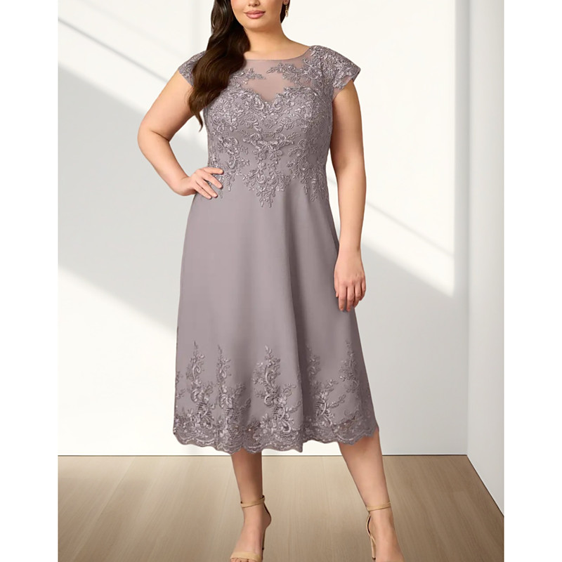 A-Line Tea Length Party Dress Cocktail Dress Wedding Guest Dress Mother of the Bride Dress Short Sleeve Crew Neck Elegant Wedding Guest Engagement Party Chiffon with Appliques