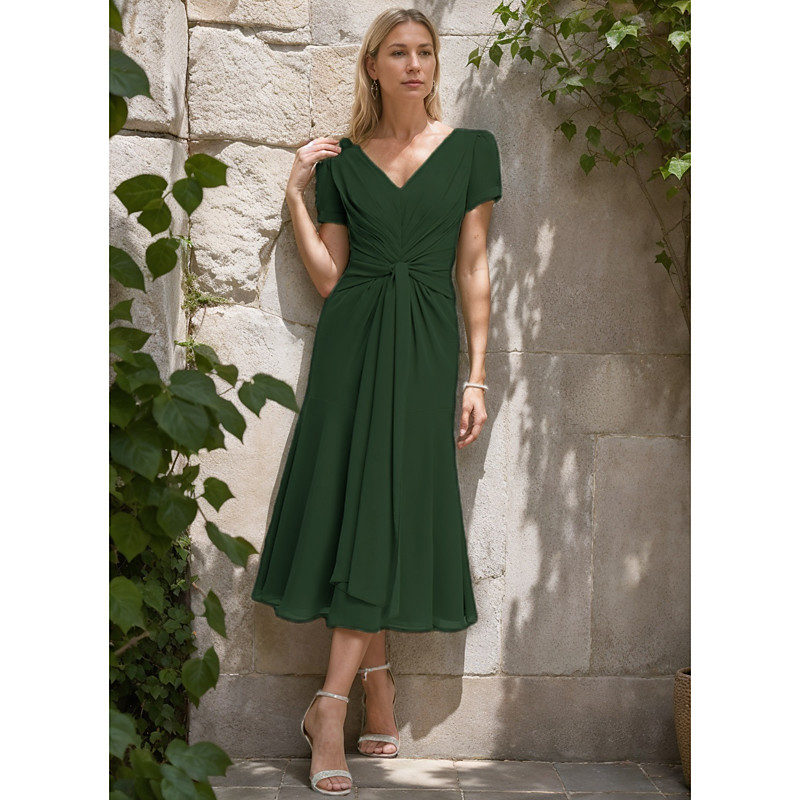 A-Line Mother of the Bride Dress Formal Wedding Guest Elegant Simple Minimalist V Neck Tea Length Chiffon Short Sleeve with Pleats Ruched