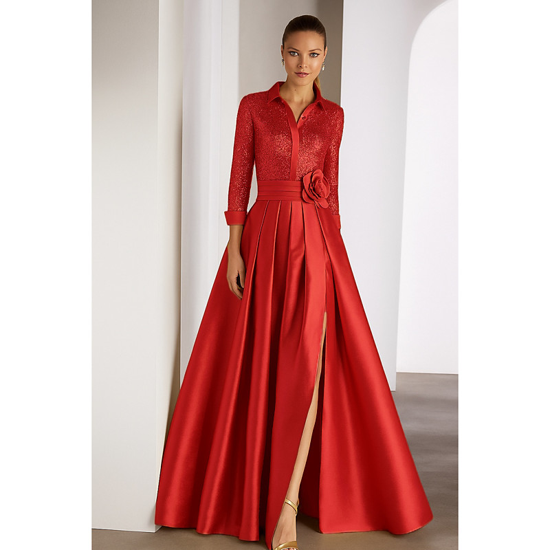 A-Line Floor Length Beaded Eembroidered Formal Dresses Mother of the Bride Dress Evening Gown Elegant Color Block High Split Half Sleeve Shirt Collar Wedding Formal Satin with Slit Appliques