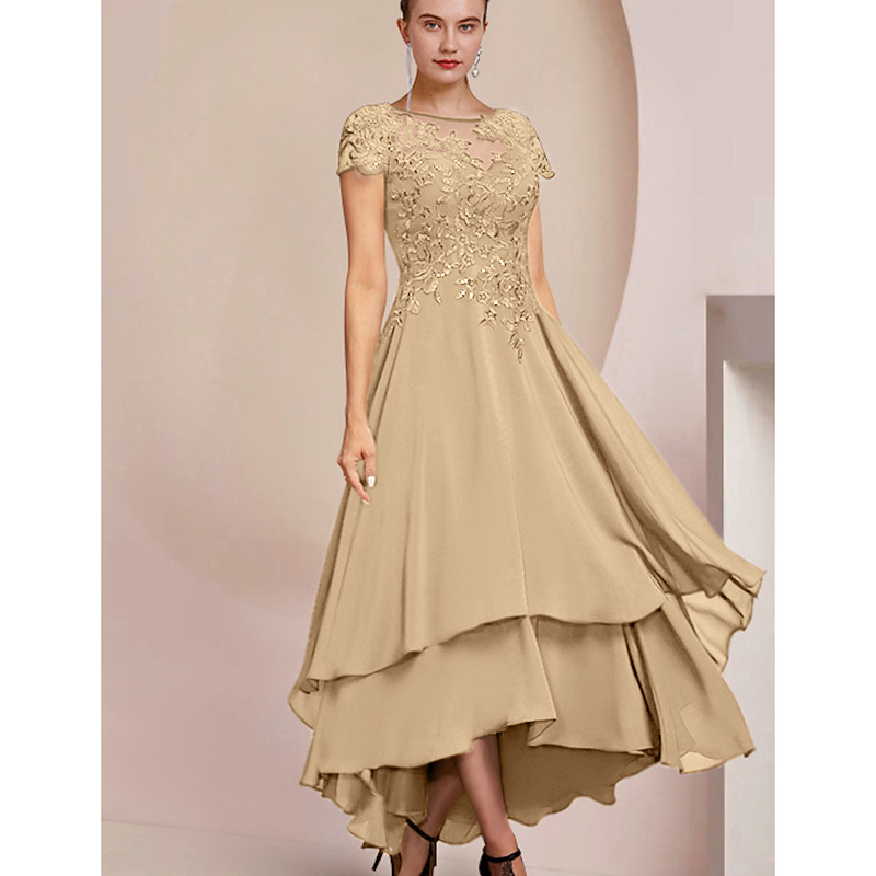 A-Line Asymmetrical Tea Length Party Dress Cocktail Dress Wedding Guest Dress Mother of the Bride Dress Short Sleeve Scoop Neck Elegant High Low Formal Wedding Guest Chiffon Lace with Sequin Appliques