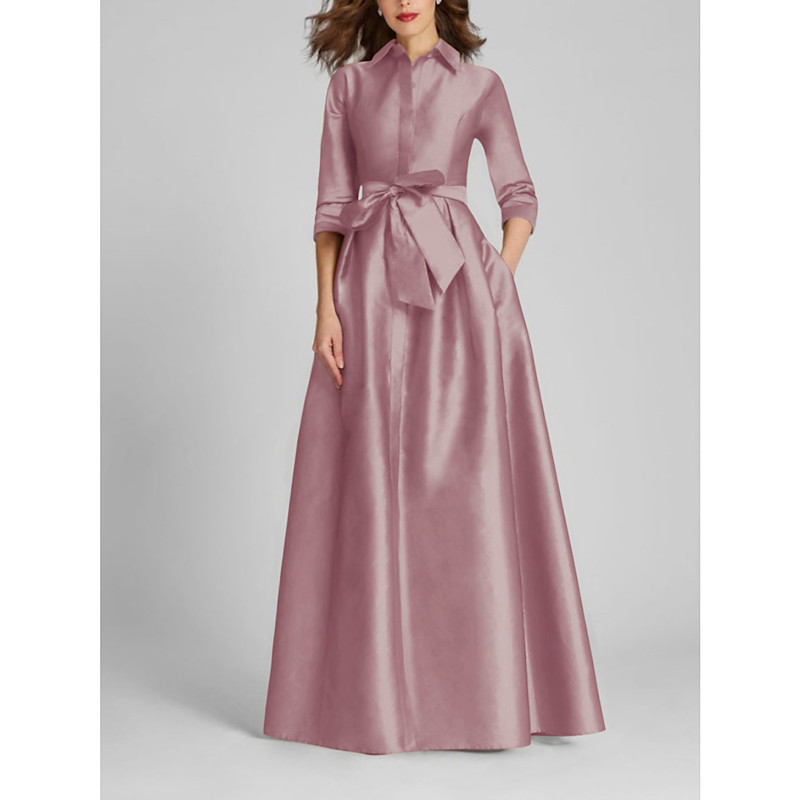 A-Line Floor Length Shirt Dress Wedding Guest Dress Formal Dresses Mother of the Bride Dress Half Sleeve Shirt Collar Minimalist Formal Wedding Guest Fall Satin with Bow(s) Pleats