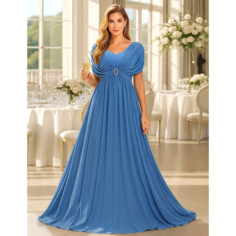 A-Line Floor Length Formal Dresses Evening Gown Mother of the Bride Dress Short Sleeve V Neck Elegant Vintage Party Formal Chiffon with Pleats Beading Ruching