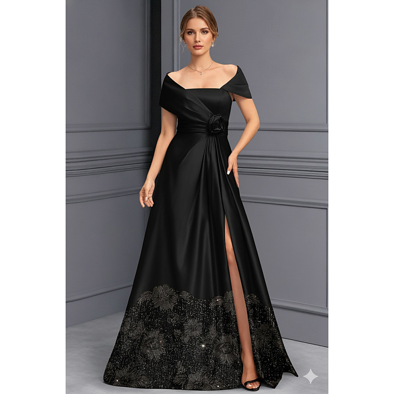 A-Line Floor Length Beaded Eembroidered Formal Dresses Mother of the Bride Dress Evening Gown Formal Dress Elegant Sparkle Silky Short Sleeve Off Shoulder Wedding Formal Capes Satin Lace with Glitter