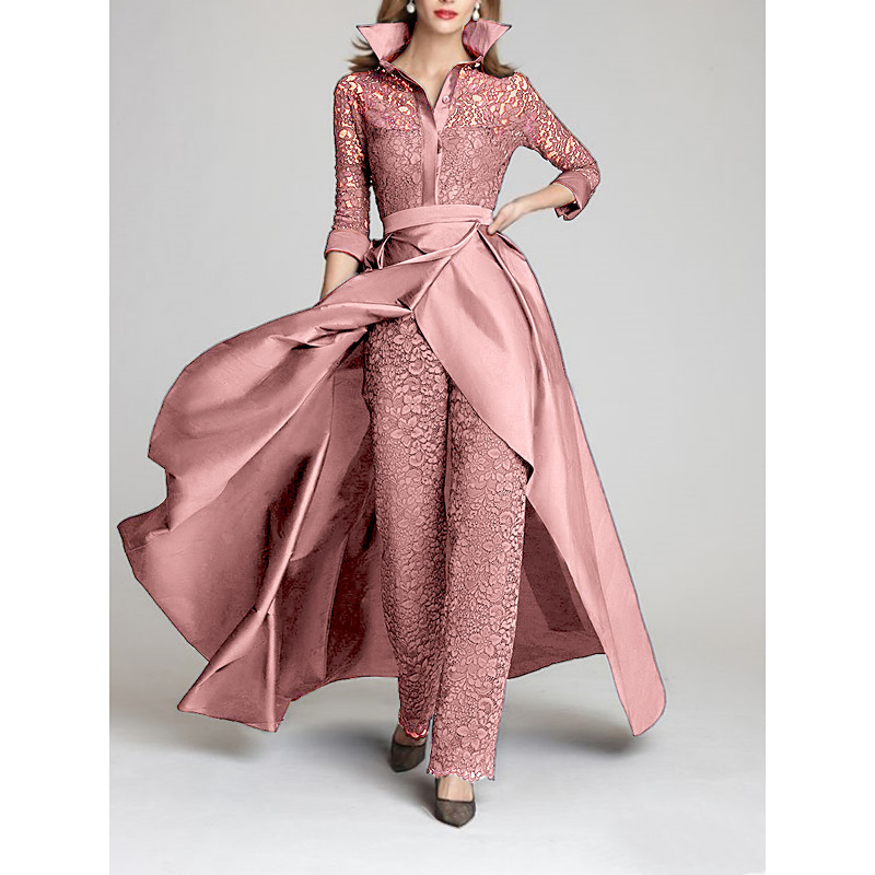 Jumpsuit Pantsuit Floor Length Mother of the Bride Dress 3/4 Length Sleeve Shirt Collar Vintage Party Formal Wedding Guest Formal Evening Satin Lace with Ruching