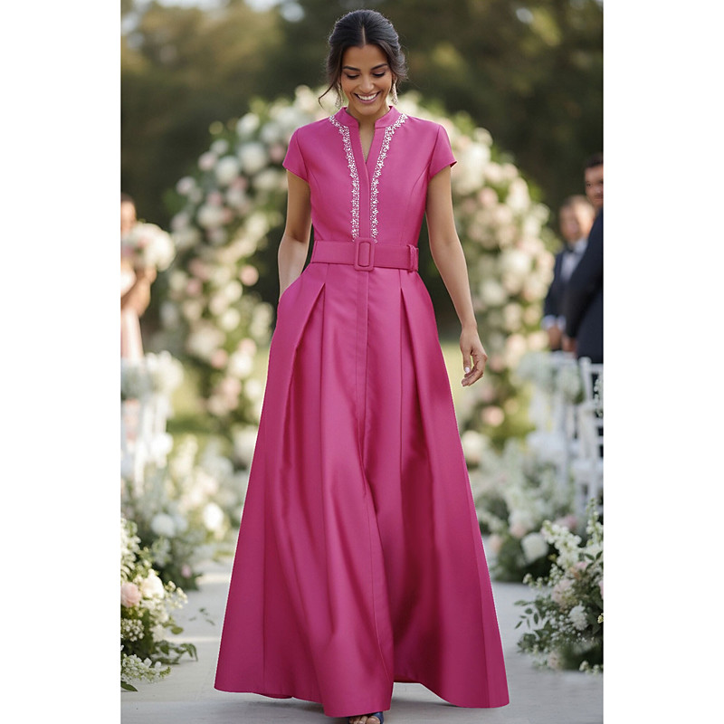 A-Line Floor Length Satin Dress Wedding Guest Dress Formal Dresses Mother of the Bride Dress Short Sleeve High Neck Elegant Formal Wedding Guest Semi Formal Satin with Sash / Ribbon Ruched