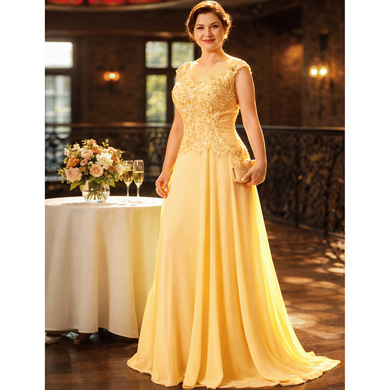 A-Line Sweep Brush Train Wedding Guest Dress Formal Dresses Evening Gown Mother of the Bride Dress Short Sleeve Illusion Neck Elegant Plus Size Party Wedding Guest Special Occasion Chiffon Beaded Lace